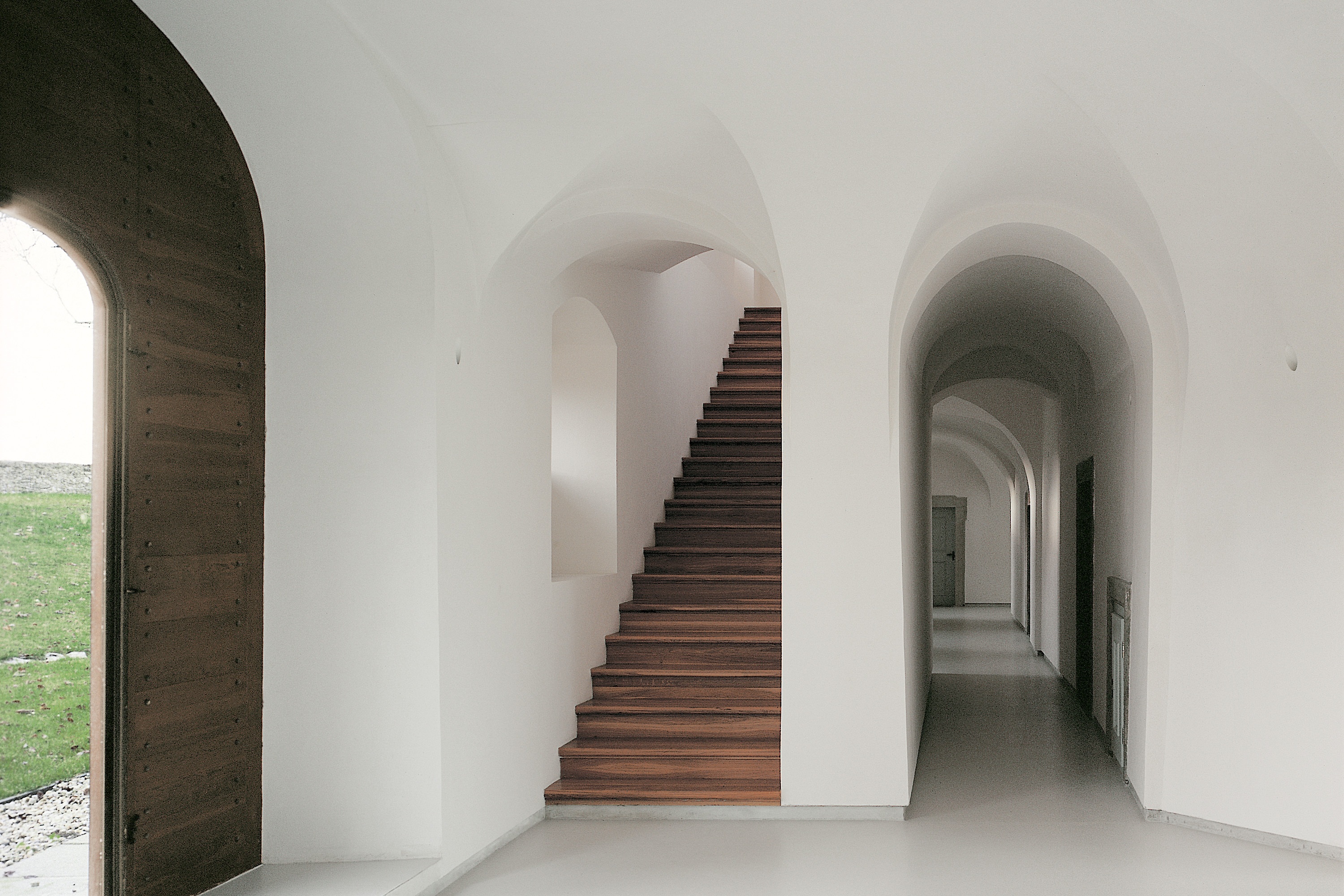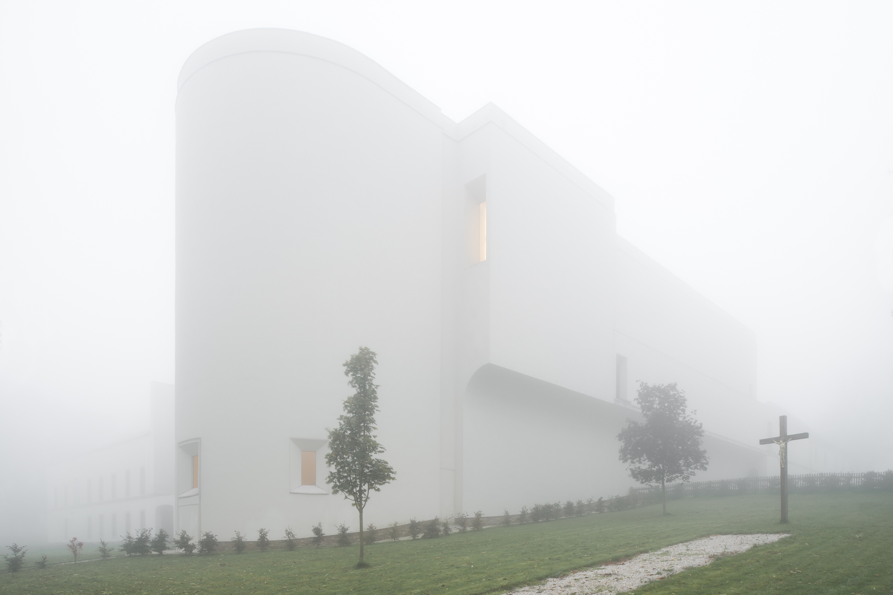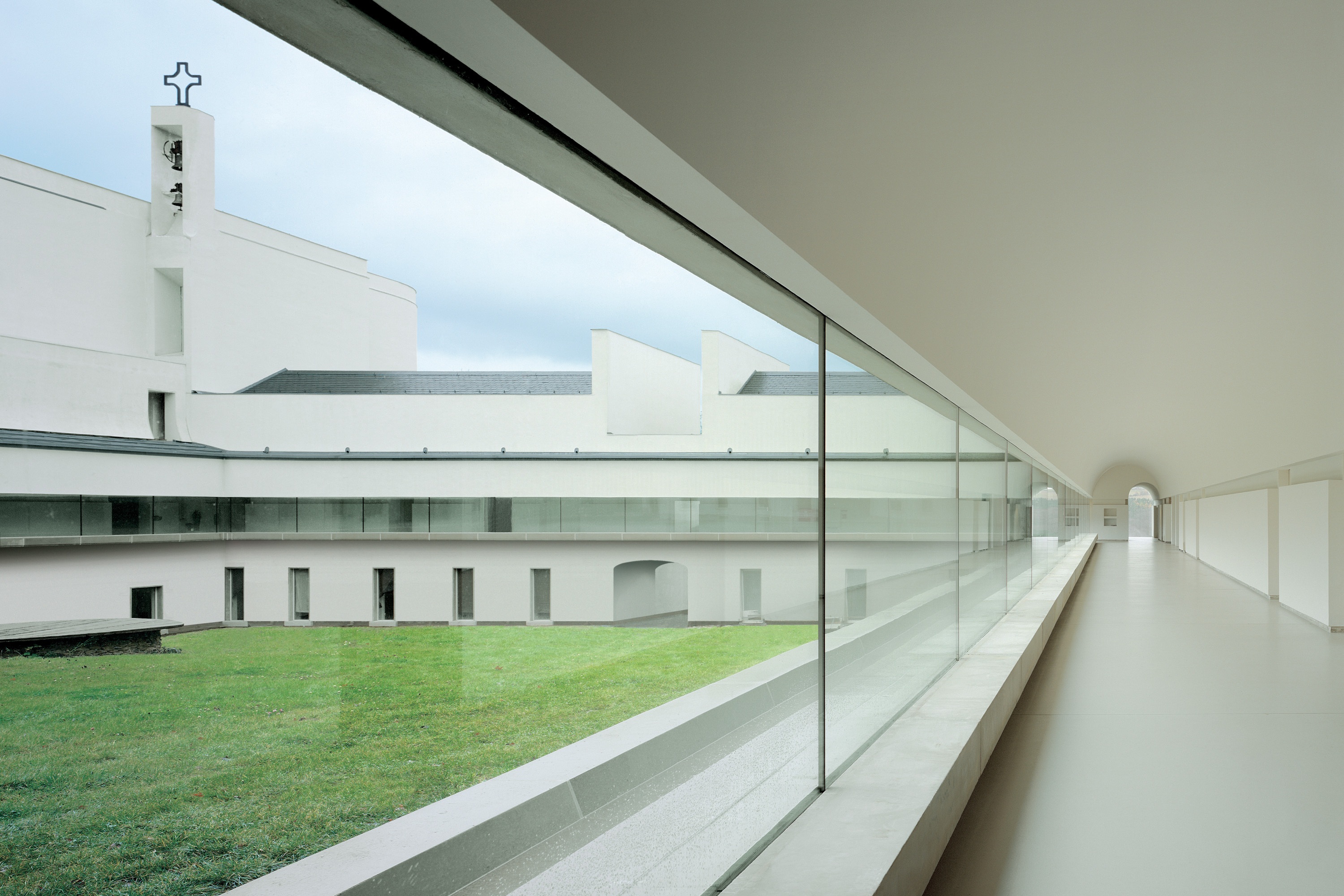 The Abbey of Our Lady of Nový Dvůr occupies an estate of 100 hectares of farmland and forest, in a remote part of Bohemia. At the time of acquisition, the site included a dilapidated baroque manor house and agricultural buildings, arranged around a courtyard. This configuration set the footprint of the main cloister complex, with the historic manor house restored to form the west wing and the remaining derelict structures replaced by new architecture, dominant amongst which is the abbey church. The design draws on St Bernard of Clairvaux’s twelfth-century blueprint for Cistercian architecture, with its emphasis on light, simplicity of proportion and clarity of space. The masterplan includes a number of satellite structures — a freestanding chapel, agricultural buildings, guesthouse, workshops and facilities for visitors — whose construction has been ongoing since the consecration of the cloister in 2004.