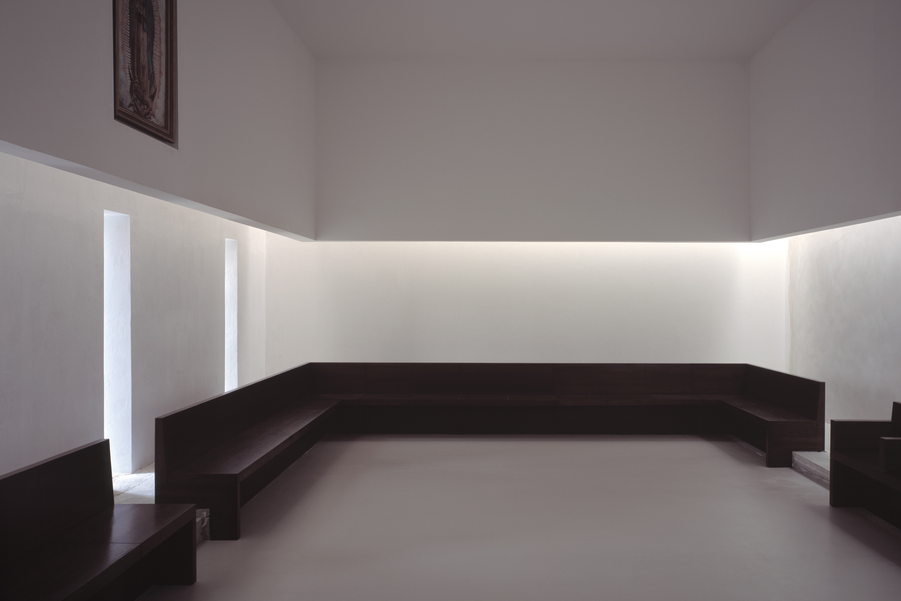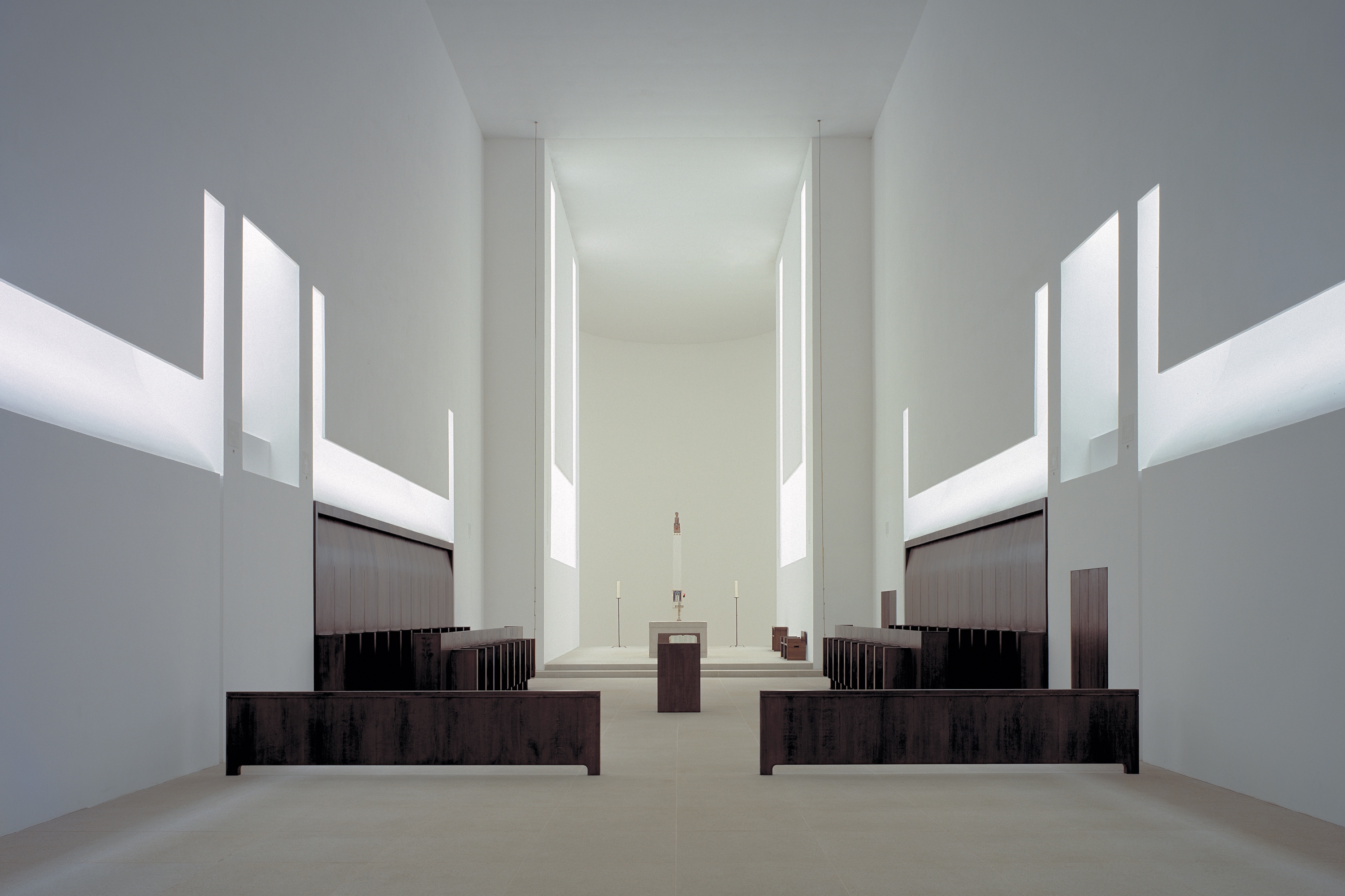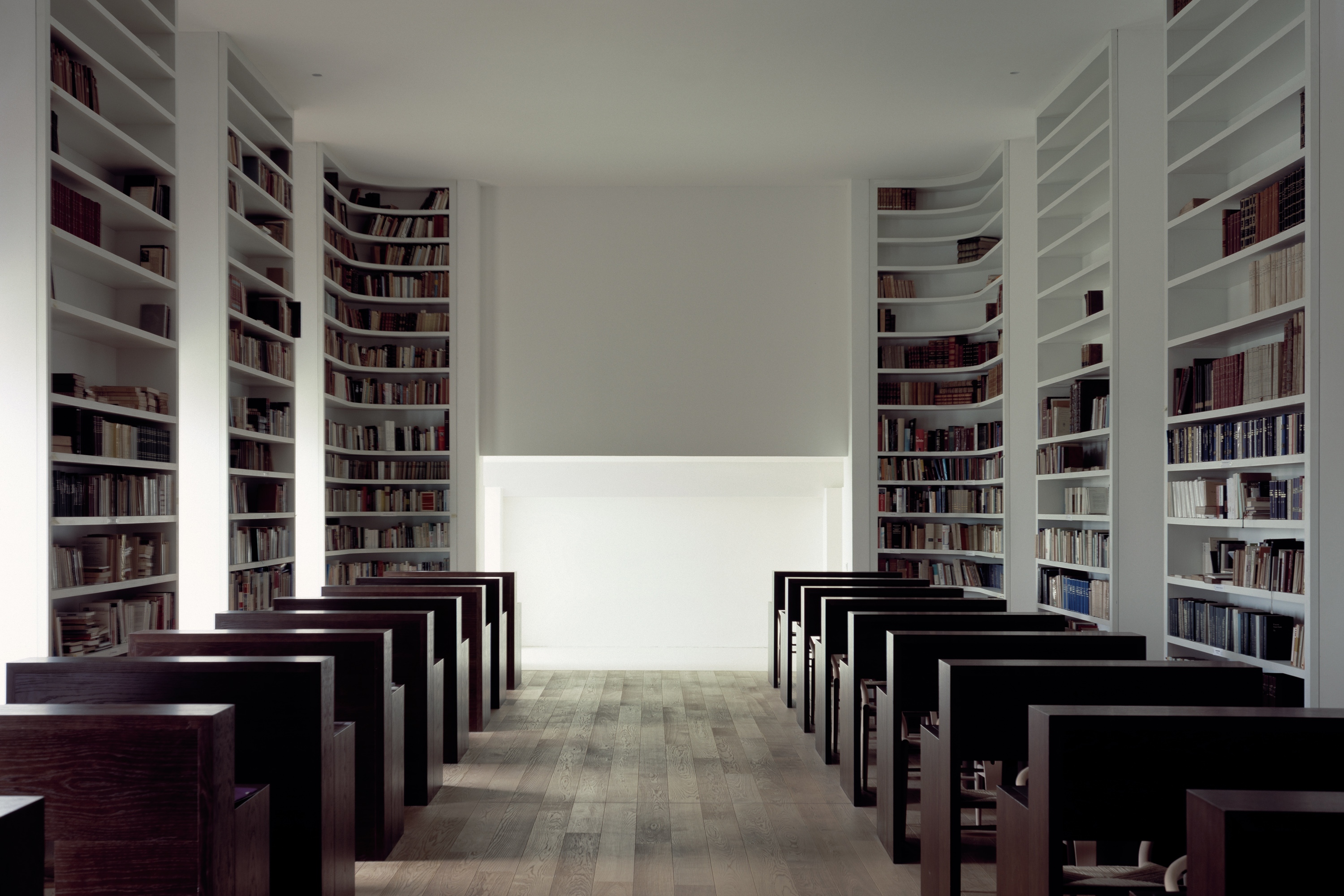 The Abbey of Our Lady of Nový Dvůr occupies an estate of 100 hectares of farmland and forest, in a remote part of Bohemia. At the time of acquisition, the site included a dilapidated baroque manor house and agricultural buildings, arranged around a courtyard. This configuration set the footprint of the main cloister complex, with the historic manor house restored to form the west wing and the remaining derelict structures replaced by new architecture, dominant amongst which is the abbey church. The design draws on St Bernard of Clairvaux’s twelfth-century blueprint for Cistercian architecture, with its emphasis on light, simplicity of proportion and clarity of space. The masterplan includes a number of satellite structures — a freestanding chapel, agricultural buildings, guesthouse, workshops and facilities for visitors — whose construction has been ongoing since the consecration of the cloister in 2004.